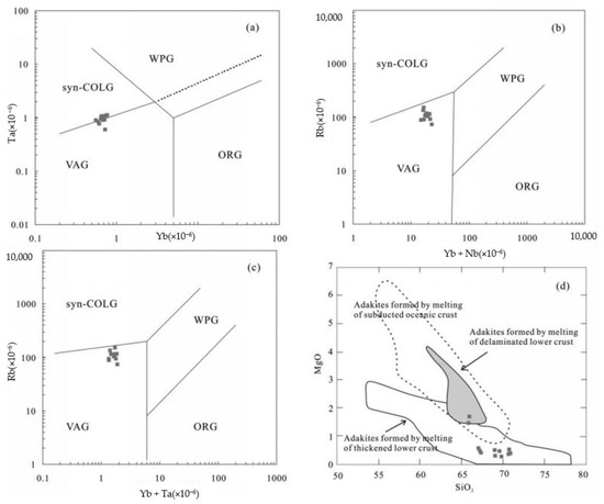 Tectonic discrimination diagrams (a–c) and SiO2-MgO diagram (d), after Lai and Qi [83]) for the Early Jurassic volcanic rocks.