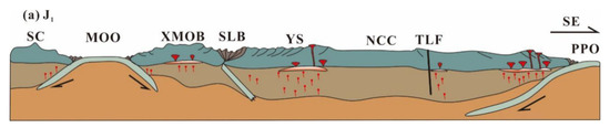 Tectonic evolution of the northern North China Craton during Early Jurassic (modified after Ma, 2013 [71]). MOO = Mongolia-Okhotsk Ocean; NCC = North China Craton; PPO = Paleo-Pacific Ocean; SC = Siberian Craton; XMOB = Xing’an Mongolian Orogenic Belt; SLB = Solonker-Linxi Suture Belt; YS = Yanshan orogen; TLF = Tan-Lu Fault.