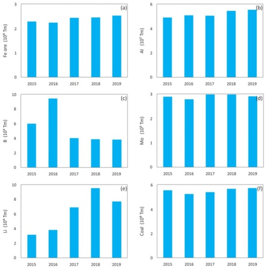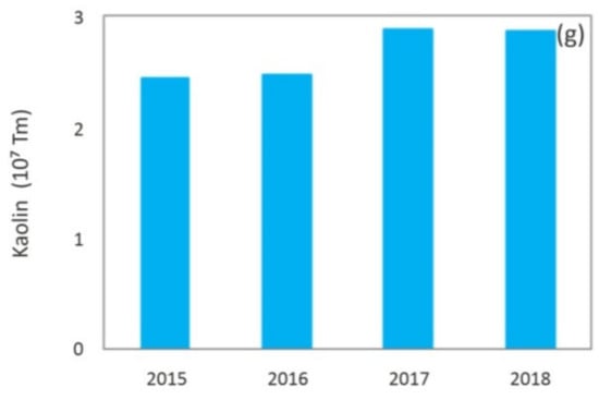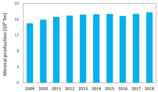 Nowadays, mining is a critical industry for global economic and social development, and it will continue to be the main resources provider in the immediate future []. However, just as there have been great technological advances in mining techniques that allow a larger recovery of minerals and therefore a continuous growth of world production, the impoverishment of deposits in terms of the grade, which requires larger scale, more complex and depth excavations, has an even higher impact on a major generation of waste. Figure 1 shows the evolution of world production of minerals in the 2009–2018 decade [], and Figure 2 shows global production, in the last years, of different metals or minerals reported in this paper, which include: iron [], aluminum [], boron [], molybdenum [], lithium [], coal [] and kaolin [], among others.