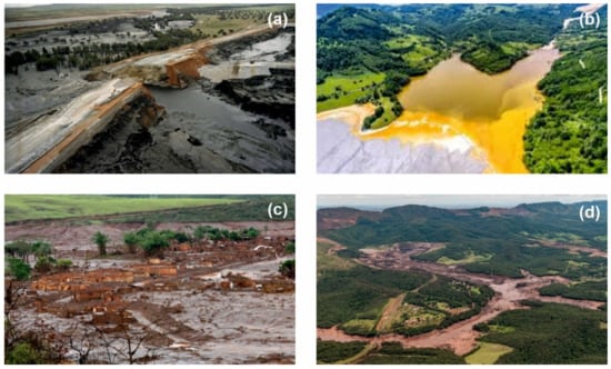 Images of several environmental disasters produced by collapse of tailing dams: (a) collapse of tailings dam in Aználcollar, Spain, 1998 []; (b) Baia Mare disaster, Romania, 2000 []; (c) Mariana dam disaster, Brazil, 2015 []; (d) Brumadinho dam disaster, Brazil, 2019 [].