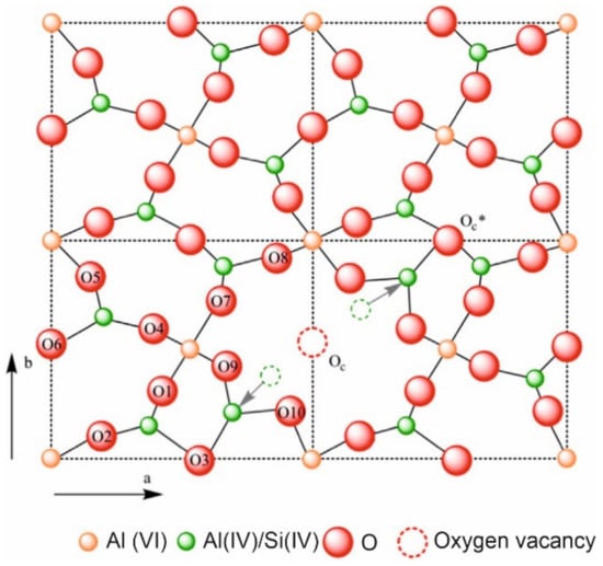 According to the Mindat database [], mullite (The name and chemical composition of the minerals and crystalline phases mentioned in this review are showed in Appendix A) is a nesosilicate, a group of silicates characterized by un-polymerized SiO4 tetrahedrons, linked to one another by ionic bonds through interstitial cations. The chemical formula is Al(4+2x)Si(2−2x)O(10−x) where x = 0.17–0.59, and is composed of 38.00 wt.% aluminum, 13.18 wt.% silicon, and 48.82 wt.% oxygen, with the empiric formula Al4.5Si1.5O9.75. Figure 4 shows the structure of mullite []. The mullite etymology is related to the place where it was found the first time in 1924, the Isle of Mull, Scotland, UK. Mullite is a crystalline phase of great technological importance due to its excellent technical properties, such as: low expansion and thermal conductivity (~4.5 × 10−6 °C−1 and 6 kcal·m−1·h−1 °C−1 at 20 °C, respectively), and appropriate fracture strength and toughness (~200 MPa y ~2.5 MPa m1/2, respectively) []. In addition, it features high creep resistance, corrosion stability and thermal stability. All these features currently make mullite to be, probably, one of the most important phases in traditional and advanced ceramic. Monolithic mullite ceramics find application in tableware [], porcelain stoneware [,], refractory [] or electronic devices []. Mullite coatings have been used successfully as environmental barrier coatings for the protection against oxidizing agents, reducing agents or aggressive chemicals at high temperatures [,]. Besides ceramic or metallic surfaces, mullite composites, including composites prepared with mullite matrix or mullite fiber, find important applications as components in turbine engines, high-performance furnaces or heat shields for space vehicles [,,].