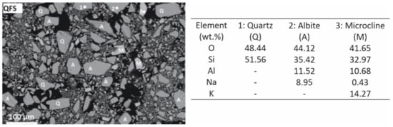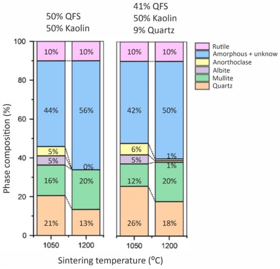 The QFS residue was composed of SiO2 as the major oxide and Al2O3, and alkaline oxides as minor components. From a mineralogical point of view, spodumene waste included albite (44 wt.%), quartz (32 wt.%), microcline (KAlSi3O8; 11 wt.%) and muscovite (6 wt.%) together with amorphous phase (7 wt.%) (Figure 6). The porcelain materials obtained after a sintering process were mainly composed of quartz (13–26 wt.%), mullite (12–20 wt.%) and amorphous phase (42–56 wt.%), the highest percentages of mullite being obtained for materials sintered at 1200 °C (Figure 7). These materials presented the best technological properties, with a dense and compact microstructure with microstructural characteristics similar to those of reference porcelain compositions. The highest compressive strength values of 90 MPa fulfilled the requirements for fired bricks, masonry bricks and ceramic pavers exposed to light traffic. As regards to bending strength, maximum values of 30 MPa were achieved, which are slightly lower than those presented by commercial porcelain stoneware tiles. Materials sintered at 1200 °C showed very low water absorption values (0.2%) corresponding to an apparent density of 2.5 g·cm−3, both properties being comparable to those reported in studies of porcelain materials. The shrinkage values on sintering were also similar to the values of approximately 20% shrinkage reported for some porcelain compositions fired at 1200 °C. As for the properties of structural materials manufactured with 80 and 90 wt.% of spodumene tailings, they exhibited values of compressive strength exceeding 17–20 MPa, which is the value required for ceramic pavers subjected to light traffic. Similarly, they showed water absorption well below 15%, complying with the requirement for ceramics with construction applications.