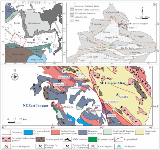 The Chinese Altay and East Junggar located along the boundary between the Siberian and Kazakhstan-Junggar terranes [34], is an important part of the Central Asian Orogenic Belt (CAOB; Figure 1a). The northern margin of the East Junggar terrane is dominated by the Dulate Paleozoic active island-arc belt, which is separated from the Chinese Altay terrane to the north by the Erqis fault (Figure 1b). Major structures in the region comprise mainly NW-trending and NNW-trending fault systems, as represented by the regional Erqis and Fuyun fault zones, respectively (Figure 1c; [26,27]). The Erqis Fault (or Irtysh Fault), striking NW-SE (290°–300°), dipping 75° to the NE, and extending 400 km, is one of the largest trans-current faults of Asia [35,36]. Previous research indicated that the Erqis Fault is a sinistral strike-slip fault, and was initiated from 290 to 275 Ma [36,37,38,39]. The Fuyun Fault, which has strikes of 342° (NNW) with dips of approximately 70° to the east, and extends 200 km, crosscuts the Erqis Fault and was considered to be dextral strike-slip fault [40,41].