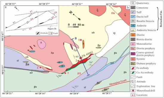 Structural map (a) and geologic map (b) of the Laoshankou deposit (modified from [29] and Xinjiang Geological Survey, unpublished). Abbreviations: F1, Fuyun Fault; F2, Shanqian Fault; F3, F4, F5, F6, unnamed secondary faults. Sample locations: 1, LS-024-2, LS-024-3; 2, No. 5 pit, LS-006; 3, Stock heap, LS-026, LS14-012-5, LS14-012-6, LS14-012-7; 4, TS-001, TS-001-7.