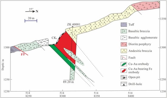The Laoshankou Fe-Cu-Au deposit has an estimated metal reserve of 3.26 Mt Fe at 33.5–36.42%, 9.8 kt Cu at 0.19–0.41%, and 0.14 t Au at 0.49–1.31 g/t [29,53]. The ore-bodies are hosted in the Middle Devonian Beitashan Formation (380.5 ± 2.0 Ma; [54]) that contains mainly basaltic/and esitic breccias and tuffs intercalated with fossiliferous limestone (Figure 2b). The basaltic breccias are mainly located in the footwall of the orebody, while the andesitic breccias are located in the hanging-wall of the orebody (Figure 3). Monzodiorite and diorite porphyry have close temporal and spatial relationship with Fe-Cu-Au mineralization in the Laoshankou deposit, with zircon U-Pb ages of 379.2 ± 4.4 Ma and 379.7 ± 3.0 Ma, respectively [45,55], which usually crosscut the earlier Beitashan volcanic rocks. There are two large NW-trending faults in the deposit, i.e., the Fuyun Fault in the north (dips at 60°–70°) and the Shanqian Fault in the south (dips at ~70°, subparallel to Fuyun Fault) (Figure 2a; [29]). A series of subsidiary E-W-striking faults (i.e., F3, F4, F5 and F6) are present between Fuyun and Shanqian faults, and divided the ore district into a number of rhombic sectors.