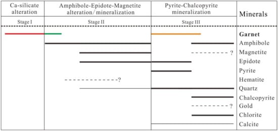 Pervasive pre-mineralization Na-Ca silicate alteration were preserved at the Laoshankou deposit, and two-stage mineralization of Fe and Cu-Au were precipitated in a multi-phase paragenetic sequence. Three hypogene hydrothermal alteration and mineralization stages (Figure 4; [26]) include the Ca-silicate alteration (Stage I), amphibole-epidote-magnetite alteration/mineralization (Stage II) and pyrite-chalcopyrite mineralization (Stage III). The Ca-silicate alteration (Stage I) is recorded mainly by garnet with lesser amounts of pyroxene/diopside and scapolite in the wall rocks adjacent to orebodies. The amphibole/actinolite-epidote-magnetite alteration/mineralization (Stage II) is the main mineralization stage characterized by abundant magnetite, amphibole/actinolite, epidote with minor prior garnet. Abundant sulfide minerals are present in the pyrite-chalcopyrite mineralization (Stage III) with two major mineral associations, i.e., pyrite-epidote-quartz-garnet and chalcopyrite-amphibole/actinolite-chlorite/ripidolite-pycnochlorite (-garnet). Garnets formed in all three stages.