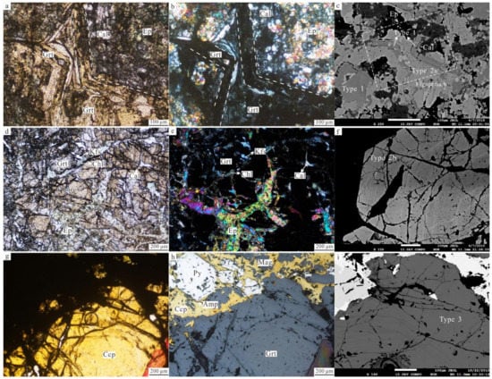 Based on geology, transmitted-reflected light microscopy, BSE and EPMA studies, garnets from the Laoshankou deposit can be divided into three types with changes in color. There is no obvious contact interface between the different garnets. (1) Type 1, the brown garnet in stage I occurs in the volcanic wall rocks (Figure 5a,b) with allotriomorphic texture (Figure 6a–c), which is optically dark and homogeneous in BSE images (Figure 6c). Type 1 garnet is generally replaced by the subsequent Type 2 garnet, magnetite, epidote, albite, and calcite (Figure 5b and Figure 6a,b) with preservation of their original textures. (2) Type 2, the dark red garnet in the early sub-stage of stage II forms adjacent to the orebody (Figure 5c) or cross-cuts the diorite porphyrite near the orebody (Figure 5d) with fine-grained texture (Figure 6d–f), which coexists with K-feldspar and is replaced by subsequent epidote, calcite and chlorite (Figure 6d,e). Two forms of Type 2 garnet occur, the Type 2a garnet is irregular and replaces the Type 1 garnet (Figure 6c), while the Type 2b has unobvious oscillatory zoning on the scale of an individual crystal (Figure 6f). (3) Type 3, garnet is yellow-green and coexists with sulfides, quartz, amphibole and chlorite (Figure 5e,f) with obvious coarse-grained texture (1–5 mm; Figure 6g–i) at pyrite-chalcopyrite stage. The back-scattered electron images and reflected light images show that the Type 3 garnet is homogeneous without zones (Figure 6i).