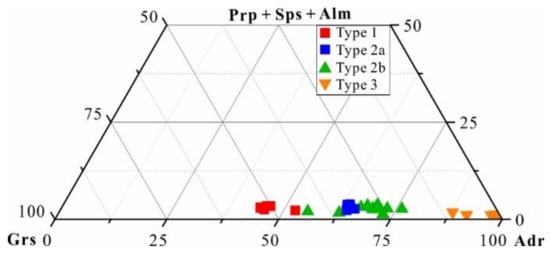(3) Type 1 and 2 garnets show higher total REE contents, LREE-depletion, HREE-enrichment, and positive Eu anomaly, while Type 3 garnet shows lower total REE contents, LREE-enriched, HREE-depleted, and strongly positive and variable Eu anomaly.