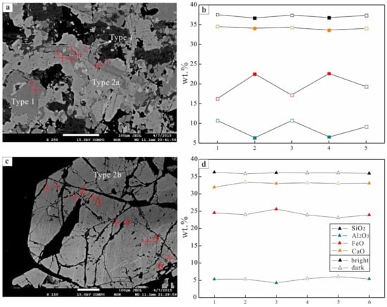 Electron microprobe analyses show that the andradite content increases steadily for garnets from stage I to stage III in the Laoshankou deposit, ranging in composition from Adr44Grs53 to almost pure andradite Adr100 (Figure 7) with almandine, spessartine, pyrope and uvarovite collectively less than 5% (Table 2). The textural and optical characteristics of different types of garnets show a clear correspondence with major element compositions (Figure 8). Type 1 garnet has poor compositional zoning and mainly contain SiO2 (36.78–37.53 wt.%), CaO (33.64–36.05 wt.%), Al2O3 (9.13–10.90 wt.%), and FeOT (12.99–19.33 wt.%) with a small amount of TiO2 (0.07–1.50 wt.%), MnO (0.85–1.06 wt.%), and MgO (0.04–0.20 wt.%), yielding an end-member formula of Grs44–53Adr44–53Sps2–3Uv0–2Prp0–1, which is more enriched in grossularite (Figure 7). Compared with Type 1 garnet, the Type 2 garnets have higher concentrations of FeOT, but lower concentrations of Al2O3 (Figure 8a,b), which are all located in the Al-rich andradite field (Figure 7). Type 2a garnet is xenomorphic granular and has poor compositional zoning, yielding an end-member formula of Adr63–66Grs31–34Sps2–3Prp0–2Uv0–1. The concentrations of SiO2, CaO, Al2O3, and FeOT are 36.27–36.85 wt.%, 33.17–34.89 wt.%, 6.13–6.82 wt.% and 18.70–22.62 wt.%, respectively. The Type 2b has unobvious oscillatory zoning and fine-grained texture (Figure 6f and Figure 8c) with stable SiO2, CaO, Al2O3, and FeOT concentrations (Figure 8c,d). The SiO2, CaO, Al2O3, and FeOT concentrations of Type 2b garnet are 35.05–36.62 wt.%, 31.95–35.43 wt.%, 4.26–8.06 wt.% and 16.72–25.62 wt.%, yielding an end member formula of Adr55–77Grs21–43Sps0–4Prp0–2Uv0–1. In comparison, the Type 3 garnet contains the highest concentrations of FeOT (27.89–29.74 wt.%) and lowest concentrations of Al2O3 (0–1.45 wt.%), which are plot in the andradite component (Figure 7), yielding an end member formula of Adr91–100Grs0–8Sps0–2Prp0–1Uv0–1.