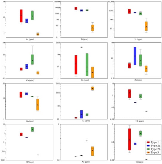 Box-plots of trace elements in different garnets from the Laoshankou deposit.