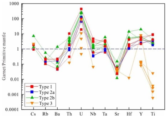 The normalized multi-element diagram shows that all garnets in Laoshankou are generally depleted in large ion lithophile elements (LILEs, e.g., Rb, Sr, and Ba) relative to the average primitive mantle [59]. However, high field strength elements (HFSE) show a more consistent variation with major element geochemistry and petrographic observations. Both Type 1 and Type 2 garnets have higher U, Th, Hf, Y, and Ti, compared to the average primitive mantle (Figure 10). In contrast, Th, Nb, Hf, Y, and Ti compositions of Type 3 garnet are lower than the average primitive mantle (Figure 10).