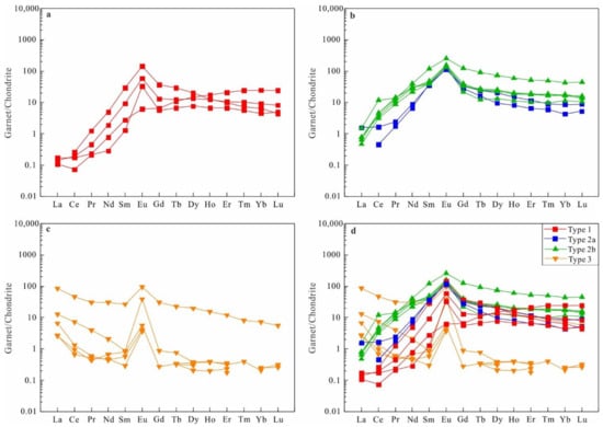 Chondrite-normalized REE patterns of different garnets from the Laoshankou deposit. (a) Type 1 garnet; (b) Type 2a and Type 2b garnets; (c) Type 3 garnet; (d) incorporation of different types of garnet. Normalization values are from [59].