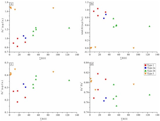 Plots of ∑REE3+ with (a) Fe3+, (b) total Al, (c) Fe2+ and (d) Fe3+/FeT (a.p.f.u., in atoms per formula unit) for garnets in the Laoshankou deposit.