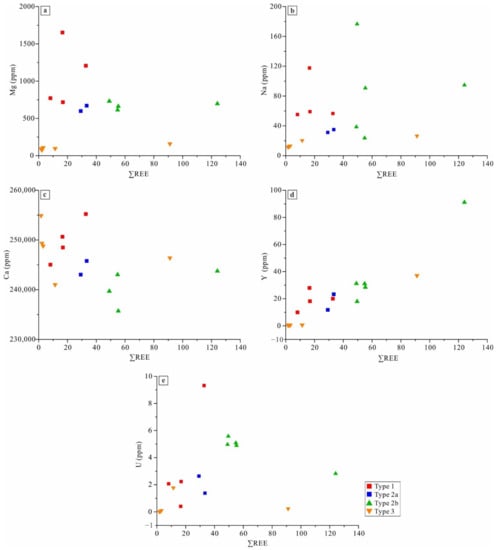 Plots of ∑REE3+ with (a) Mg, (b) Na, (c) Ca, (d) Y, and (e) U (ppm) for garnets in the Laoshankou deposit.