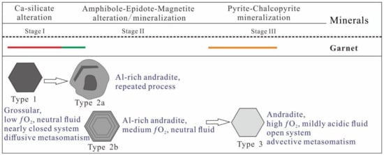 The ephemeral presence of hematite (change to mushketovite; [26,73]) at early amphibole-epidote-magnetite stage (stage II) records the increased ƒO2 from stage I to stage II (Figure 4). The compositional variation from Type 1 grossular to Type 2 Al-rich andradite (Figure 7) partly indicates the slight increase of ƒO2 from Type 1 to Type 2 garnet. However, the minimal variation of Fe3+/FeT ratios between Type 1 and 2 garnets (Figure 12d) indicates that the change of ƒO2 from stage I to stage II is indistinctive, which may explain the rapid transformation from hematite to mushketovite in stage II [26,73].