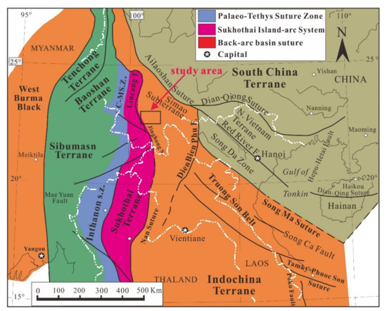 - Sone, M.; Metcalfe, I. Parallel Tethyan sutures in mainland Southeast Asia: New insights for Palaeo-Tethys closure and implications for the Indosinian orogeny. C. R. Geosci. 2008, 340, 166–179. [Google Scholar] [CrossRef]
