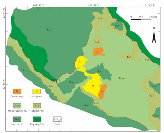 The studied area is located in the southeast of Simao Basin, near the border of China, Laos, and Vietnam (Figure 2). It is the only pre-Quaternary solid potash deposit in China. The outcrop strata in the mining area from old to new were Cretaceous, Neogenes and Quaternary. The Cretaceous outcropping strata include Jingxing Fm., Nanxin Fm., Houtousi Fm., and MYJ Fm. (Figure 3). The distribution direction of the strata and main faults is consistent with the tectonic setting of Simao Basin, which is all NW-SE direction.