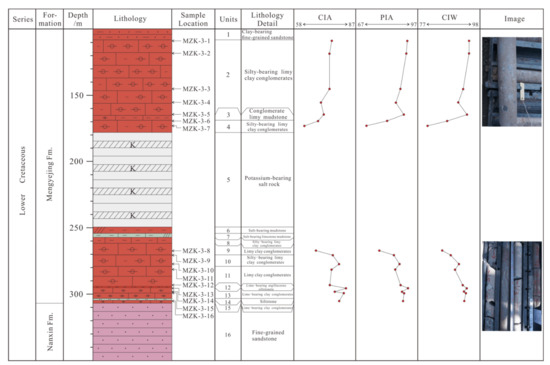There are a lot of evaporites in the Tethys domain. Potash deposits have been discovered in the Maha Sarakham Fm. in the Khorat Basin and the Mengyejing (MYJ) Formation (Fm.) in the Simao Basin, all in the east of Tethys. The surrounding rocks of the potash deposits in the Simao Basin are clay conglomerates, and the corresponding scale of carbonate and sulfate deposits are lacking. According to the difference in mineral composition, clay conglomerates can be further divided into silty clay conglomerates, lime clay conglomerates, gypsum clay conglomerates, and salt-soluble clay conglomerates. Previous studies on clay conglomerates have mainly focused on provenance and paleoclimate during deposition [1,2,3]. However, there are few reports on paleosalinity and redox conditions in the sedimentary environment, and there is still space for further discussion on paleoclimate. In this paper, emission spectra, X-ray fluorescence spectra, and plasma mass spectra in addition to chemical analysis and other data for this research were collected and used to thoroughly analyze the geochemical characteristics of main elements, trace elements, and clay minerals of the MYJ Fm. in MZK-3 and discuss paleogeographic characteristics such as paleoclimate, redox conditions, and paleosalinity of the clay conglomerates’ sedimentary period. It is hoped that it can provide useful reference for understanding the genesis of potash deposits.