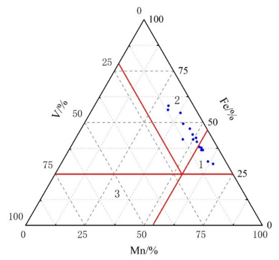 The relative content of Mn, Fe, and V and the discrimination of deposition environment. 1, strong oxidation zone; 2, weakly oxidized area, where nitrate and sulfate reduction reactions can occur; 3, reducing area.