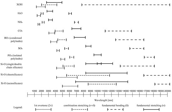Hydroxyl-related fundamental bending vibrations (δOH), which occur in all hydroxylated minerals, can occur over a large wavelength range between 8000 and 20,000 nm [23] and are, for this reason, not included in Table 4. A summary of the wavelength positions of δOH in clay minerals can be found in Madejová and Komadel [98] and for sulphates in Bishop and Murad [35]. Often, band assignments of hydroxyl bending fundamentals are discussed controversially in the literature, mainly due to overlaps with Si-O valence vibrations (e.g., for sorosilicates, see [102]).