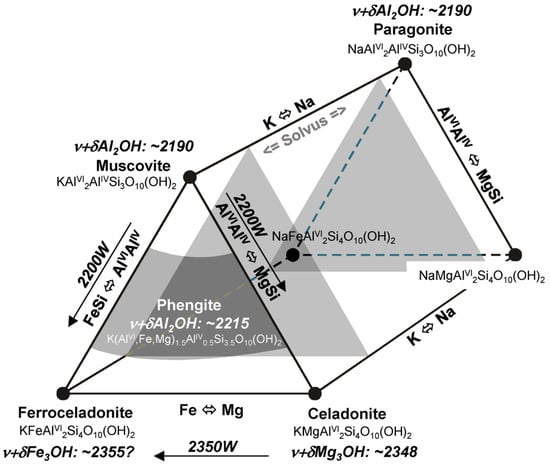 Mineral space of mica-like di-octahedral 2:1 phyllosilicates (“10 Å phases”). Locations of major absorption features in italic (values from [50,58] and own studies). The grey triangles indicate the approximate boundaries of the solvus between potassic and sodic di-octahedral micas.