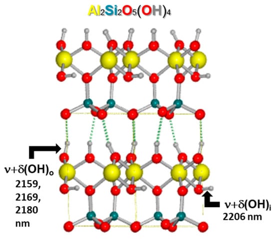 Kaolin group minerals, as the main representatives of the dioctahedral “7 Å phases”, show a characteristic doublet consisting of a major feature fixed at around 2209 nm associated with a secondary feature at around 2160 nm (Table 2) [41]. This doublet can be decomposed into four absorption bands, with the three short-wavelength bands (2159 nm, 2169 nm, 2194 nm) related to stretching vibration of the outer hydroxyl groups (ν + δAl2OHi, i.e., hydroxyl groups bond to the tetrahedral layer) and the major long-wavelength band (2209 nm) related to stretching vibration of the inner hydroxyl group (ν + δAl2OHo) [41]. Changes in the shape of this characteristic doublet are related to changes in the structure and crystallinity of the kaolin group mineral [53]. Kaolin can also display a weak to medium absorption feature at 2238 nm related to ν + δ (AlFe3+)2OH, where its intensity increases with increasing ferric iron content [54]. Other combination bands in kaolin group minerals are located at around 2330 nm and 2380 nm, overlapping with the absorption features of carbonates, amphiboles and talc.