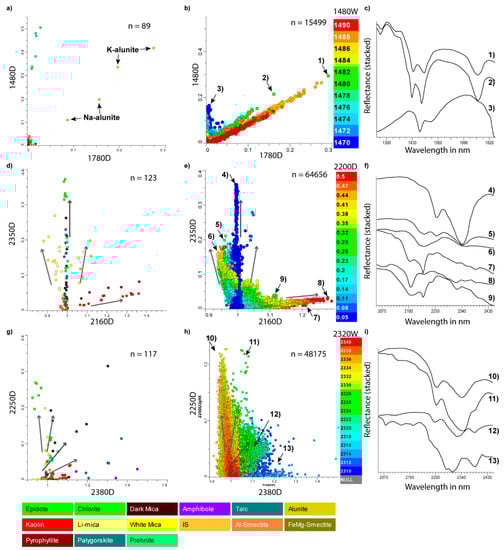 Di-octahedral 2:1 sheet silicates such as muscovite have, in contrast to the tri-octahedral 2:1 phyllosilicates (e.g., biotite), a vacant third cation site. Both tri-octahedral 2:1 sheet silicates (“10 Å phase”) and tri-octahedral 2:1:1 sheet silicates (“14 Å phase”), such as chlorites, show characteristic absorption features at around 2250 nm and 2340 nm (Table 2). In chlorites, the ν + δ(Mg,Fe2+)2OH (interlayer OH related vibrations = brucite-layer) shifts from around 2248 nm to 2261 nm [50,59] from the clinochlore to the chamosite endmember, respectively. Moreover, the ν + δ(Mg, Fe2+)3OH (inner OH of 2:1 talc layer) at around 2350 nm can shift according to the MgFe−1 exchange vector. In practice, it is observed that shifts in the 2248–2261 nm wavelength range (brucite layer) are larger and less conflicted by other minerals than the +/− 2350-nm talc layer [57].