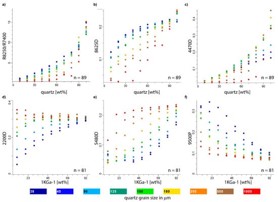 In the case of fine-grained samples, a broad transparency peak occurs and the wavelength position shifts with the changing mineral composition [84]. The transparency peak of reflectance spectra acquired from fine-grained quartz is located at around 11,000 nm [103].