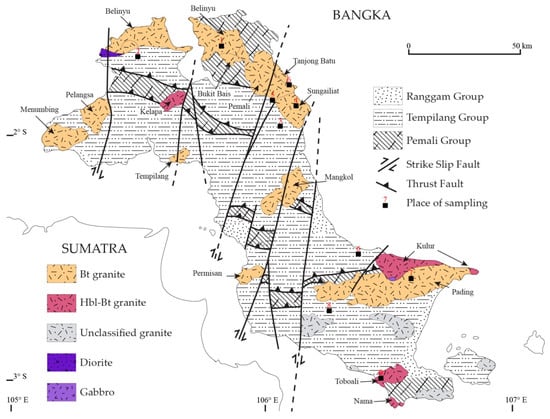 Bangka Island (Figure 1) lies in the southern continuation of the Southeast Asian Tin Belt extending from Myanmar and Thailand through the Malaysian Peninsula to the Indonesian islands [,]. Its geological evolution was related to subduction and accretion of the “Sibusmasu” islands arches (China-Siam-Burma-Malaysia-Sumatra acronym) to the Indochina terranes during the closure of Palaeotethys from the turn of the Devonian to the Middle Triassic and of the Neotethys from the Permian to the Palaeogene [,]. These tectonic events have been responsible for the formation of three granite provinces which differ both in geochemical and petrological characteristics [,]: (1) The West Granite Province with Cretaceous granites of type S and I; (2) The East Granite Province with Permo-Triassic granites of type I; and (3) The Central Granite Province with predominantly Triassic granites of type S.