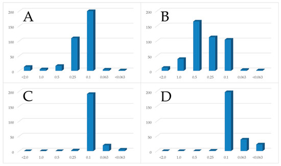 Grain size distribution in tailing samples in mm; (A) fine-grained, medium-sorted tailing from Toboali; (B) medium-sorted, poorly sorted tailing from Lubuk; (C) fine-grained, well-sorted tailing from Pemali; (D) fine-grained, medium-sorted tailing from Sungai Liat.