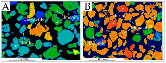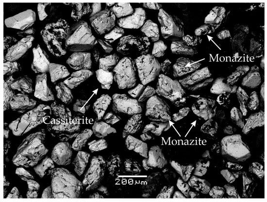 Examinations of the mineral composition of the tailing revealed its polymineral nature. The content of strategically useful constituents depends much on the sampling site: (1) black samples (more than 50 wt%) contain ilmenite [Fe2+TiO3], rutile [TiO2] and anatase [TiO2], subordinate cassiterite [SnO2] (Figure 4A); (2) white-black samples are distinctive by the presence of quartz [SiO2], zircon [Zr(SiO4)], plagioclase, ilmenite, cassiterite, pyrite [FeS2], and tourmalines; (3) pink samples (Figure 4 and Figure 5) are composed mainly of zircon, subordinate monazite-Ce [Ce(PO4)], xenotime-Y [Y(PO4)], cassiterite, rutile, and quartz; (4) orange-black samples (Figure 6) are mixtures of monazite-Ce, xenotime-Y, zircon, ilmenite, rutile, and cassiterite (Figure 4B); (5) yellow-black samples contain predominant monazite-Ce and subordinate cassiterite and rutile (Figure 5). On the basis of the predominating mineral constituent (more than 50 wt%), four types of tailings were distinguished: (1) zircon; (2) ilmenite-rutile; (3) monazite; and (4) monazite-xenotime-zircon mixture.
