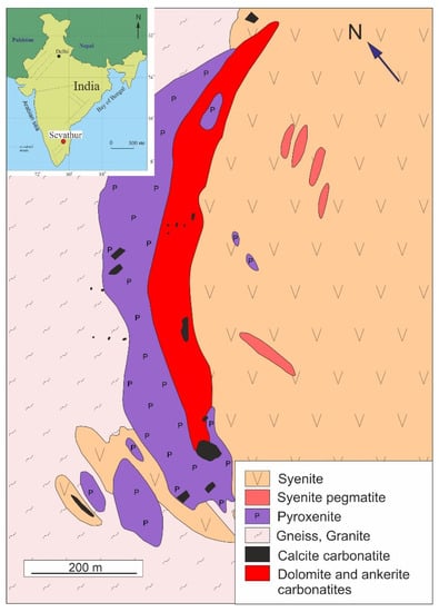 - Schleicher, H.; Todt, W.; Viladkar, S.G.; Schmidt, F. Pb/Pb age determinations on Newania and Sevathur carbonatites of India: Evidence for multi-stage histories. Chem. Geol. 1997, 140, 261–273. [Google Scholar] [CrossRef]