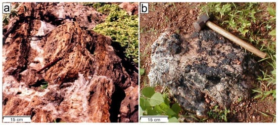(a) Primary banding in the dolomite carbonatite outcrop at the Sevathur and (b) lumps rich in magnetite, pyrochlore and monazite.