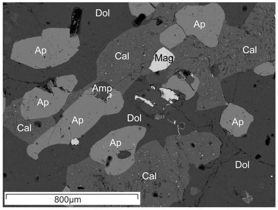 Association of calcite (Cal), apatite (Ap), magnetite (Mag), amphibole (Amp) and dolomite (Dol).