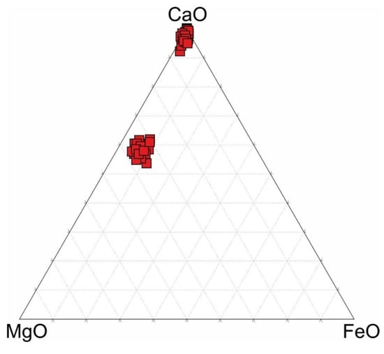 Calcite (CaCO3) formed later than dolomite and is interstitial between dolomite grains (Figure 3 and Figure 4). It contains SrO, MgO and low amounts of FeO and MnO; sometimes it contains BaO (Table 1). Using the diagram of Goldsmith [] we obtained that the sub-solidus temperature of formation of calcite-dolomite is 600–650 °C. An average overall composition of the mixed carbonate was calculated by multiple spots on SEM/EDS (FeO 1.48–1.52, MnO 0.63–0.66, MgO 3.82–4.63, CaO 44.68–44.13, SrO 1.65–2.08).