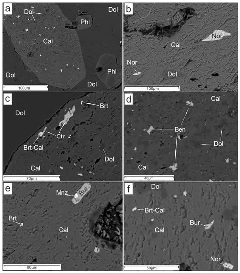 Calcite contains exsolved dolomite (Figure 6). It also contains small inclusions of norsethite, baryte, strontianite, barytocalcite, benstonite and calcioburbankite (Figure 6).