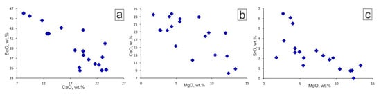 Similar barium-rich micas are typical of some kimberlites [] and also occurred in some carbonatite complexes, for example, in the Guli massif from the Maymecha–Kotuy province [] and in the Chuktukon massif from the Chadobets upland in Russia [], the Palabora Carbonatite Complex, South Africa [] and in the metasomatized mantle xenoliths [].