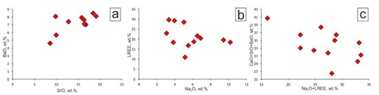 Calcioburbankite (Na3(Ca,REE,Sr)3(CO3)5) forms small (up to 30 µm, Figure 6) inclusions within calcite and associates with monazite, benstonite, norsethite and baryte. It is characterized with varying concentrations of Na2O, BaO, SrO, CaO, and TR2O3. The Sevathur calcioburbankite formulae can be expressed as: (Na0.69–2.33Ca0.67–2.09)(Sr0.59–1.31LREE0.8–1.28Ba0.17–0.39)[CO3]5. A positive correlation between BaO and SrO; a negative correlation between TR2O3 and Na2O, CaO + SrO + BaO and Na2O+LREE are presented on Figure 8. The correlation coefficient of the Sevathur calcioburbankite is close to 1 (+0.68), then there is a positive correlation between BaO and SrO. The correlation coefficients between LREE and Na2O, CaO + SrO + BaO and Na2O + LREE (−0.38 and −0.56 respectively) indicate a weak negative correlation between these variables and, also, a low dependence.