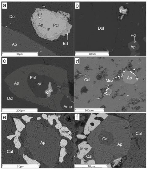 (a–c) Association of apatite (Ap), phlogopite (Phl) and pyrochlore (Pcl) in dolomite (Dol). (d–f) Monazite (Mnz) grains around apatite (Ap). Cal—calcite, Brt—baryte, Amp—amphibole.