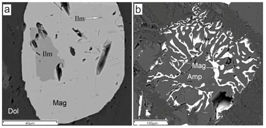 (a) Ilmenite (Ilm) in magnetite I (Mag) and (b) magnetite II in amphibole (Amp). Dolomite (Dol).