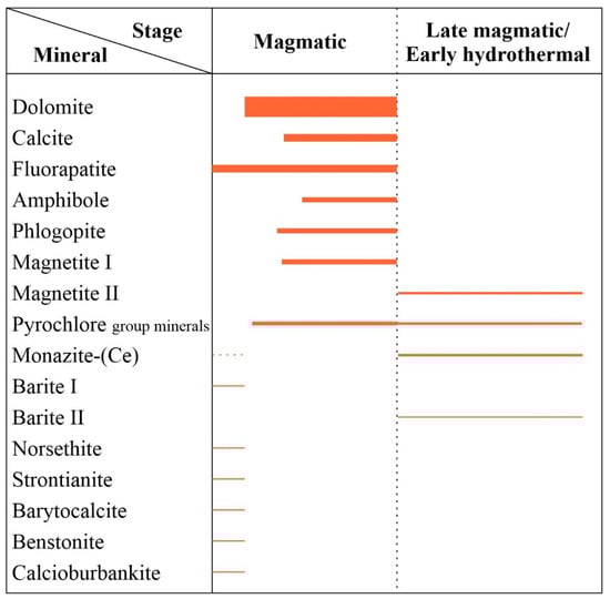 The proposed paragenetic sequence of minerals in the Sevathur carbonatites. Note: Line thickness indicates deposition intensity, the dotted line indicate possible mineral precipitation.