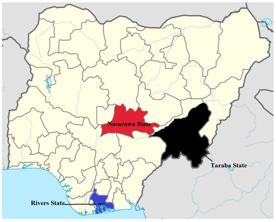 Map of Nigeria showing active mining sites for various minerals [18]. The location and local Government area of the mine sites is shown in Table S1 (Supplementary Materials).