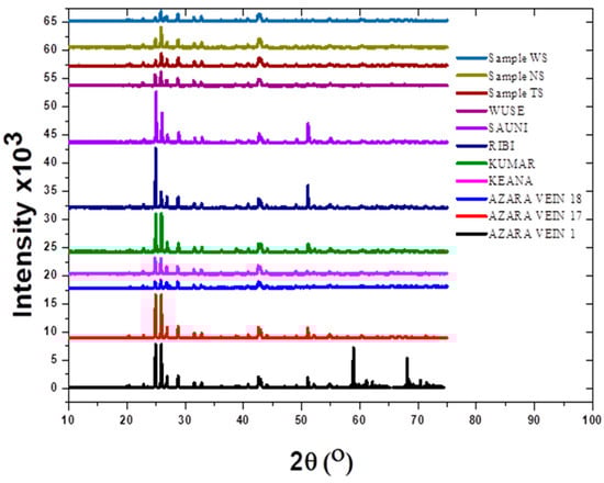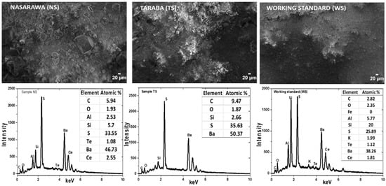 The scanning electron microscope (SEM) and energy dispersive X-ray (EDX) analysis of morphology and element percentage composition data are shown in Figure 2 and supplementary information Figure S1 (Supplementary Materials). The morphology of samples NS, TS, Azara vein 1, Azara vein 17, Azara vein 18, Keana, Kumar, Ribi, Sauni, Wuse, and WS, showed surfaces of barite embedded form of material structure with clear unit boundaries. The working standard sample (WS) showed a fine surface in the morphology monograph. The surface chemical analysis was carried out with EDX, revealing the different elemental compositions of the material in-depth surfaces (Table 1). Sample NS revealed a composition of Ba as 46.73%, S as 33.55%, and oxygen as 1.93%. This gave 82.21% of the Ba-S-O empirical composition. Sample TS showed a composition of Ba as 50.37%, S as 35.63%, and oxygen as 1.87%. This gave 87.87% of the Ba-S-O empirical composition. Sample Azara vein 1 showed a composition of Ba as 51.73%, S as 43.36%, and oxygen as 2.11%. This gave 97.2% of the Ba-S-O empirical composition. Sample Azara vein 17 showed a composition of Ba as 38.59%, S as 36.84%, and oxygen as 2.88%. This gave 78.31% of the Ba-S-O empirical composition. Sample Azara vein 18 showed a composition of Ba as 34.79%, S as 31.48%, and oxygen as 3.74%. This gave 70.01% of the Ba-S-O empirical composition. Sample Keana showed a composition of Ba as 50.12%, S as 42.75%, and oxygen as 3.14%. This gave 96.01% of the Ba-S-O empirical composition. Sample Kumar showed a composition of Ba as 31.36%, S as 23.82%, and oxygen as 4.18%. This gave 59.36% of the Ba-S-O empirical composition. Sample Ribi showed a composition of Ba as 51.38%, S as 44.17%, and oxygen as 2.59%. This gave 98.14% of the Ba-S-O empirical composition. Sample Suani showed a composition of Ba as 51.17%, S as 44.75%, and oxygen as 3.94%. This gave 99.86% of the Ba-S-O empirical composition. Sample Wuse showed a composition of Ba as 51.42%, S as 42.58%, and oxygen as 2.98%. This gave 96.98% of the Ba-S-O empirical composition. Sample WS showed a composition of Ba as 38.26%, S as 25.89%, and oxygen as 2.35%. This gave 66.5% of the Ba-S-O empirical composition. The working standard sample showed a much lower element composition empirical percentage indicating that most of the samples will be suitable for drilling purposes [23,24,25,26].