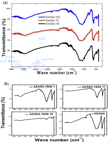 The FTIR technique was used for bond identification for chemical structures in the materials. This is used as a fingerprint for the mineral group identification and information about the structure of the mineral. The FTIR spectra for the samples are shown in Figure 3a,b and supplementary information Figure S2. All samples show several peaks in both fingerprint and functional regions which are comparable to the working standard material (WS). There are strong peaks at 600, 1059, 1197 cm−1 wavenumber in the fingerprint region and 1640, 2047, and 3468 cm−1 wavenumber in the functional region. The peaks at 600 cm−1 with strong transmittance indicate the Ba-S-O polyhedral stretching which is the sheet structure of barite minerals. The peak at 1059 cm−1 demonstrates the triple asymmetric S-O stretching in barite which also indicates the stretching of SO42− tetrahedral. The peak at 1197 cm−1 shows the asymmetric and bond vibration [27]. In the functional region, the samples depicted peaks at different wavenumbers. The peak at 1640 cm−1, which is medium, indicates the stretching vibration of the oxygen group. This is an indication of the S-O bond for the structure. The peak at 2047 cm−1 shows the formation of the Ba-S-O bond stretching vibration in the functional region. This contributes to the empirical structure of barite [28]. The peak formation at 3468 cm−1 indicates the OH stretch which is due to the formation of crystalline structure in the material [27,29]. The peaks in the samples NS and TS are matching with those of the working standard sample. This means that the samples have the same functional groups which match the working standard sample. The sample results are identical to others in the literature [30].