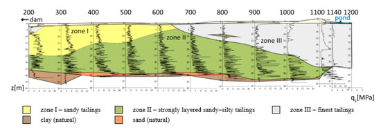 | I | Beach | Zone with the highest bearing capacity and rigidity: – a direct subsoil of the embankment in the area of the dam is built with a layer of sandy tailings and a thickness of 25 m; towards the pond, the layer gets shallower until it completely disappears in the shoreline; sandy grains and the beach drainage system excludes the generation of pore water pressure excess in tailings [59], – below the profile there is a zone with a characteristic, strongly layered sandy-silty structure with varying thickness of interlayers; sandy interlayers are a filtration path that limits the formation of pore water pressure excess in silty tailings. |