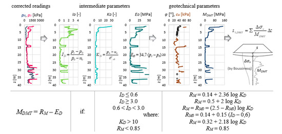 - Marchetti, S.; Monaco, P.; Totani, G.; Calabrese, M. The Flat Dilatometer Test (DMT) in Soil Investigations. A Report by the ISSMGE Committee TC16. Ground Property Characterisation from In–situ Testing; Proc. In Situ; 2001, p. 41. Reprinted in Proc. DMT; 2006, Washington, DC, USA. Available online: https://www.marchetti-dmt.it/conference/dmt15/papers%20DMT%202015%20(pdf)/TC16%20DMT%20Report%202001.pdf (accessed on 29 March 2021).