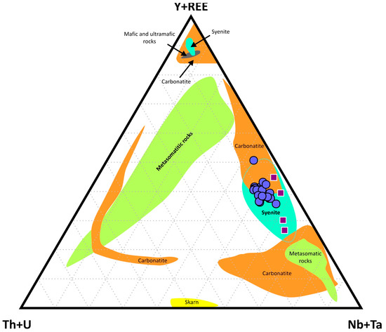 - Yttrialite, monazite, chevkinite, and britholite are diagnostic of moderately alkalic to alkali-calcic syenite intrusives;