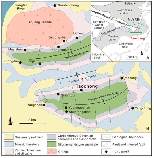 (A) Simplified structural map showing the locations of the Middle–Lower Yangtze River metallogenic belt (MLYRB) and Fanchang district (modified from [21,31]). (B) Geological map of the Fanchang district (modified from [32]).