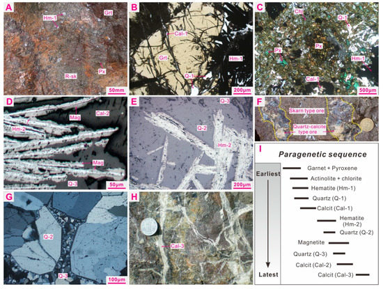Photographs of representative samples from the Taochong iron deposit. (A) Skarn-type ore with metasomatic relict texture and disseminated structure. (B) Garnet (Grt) replaced by hematite (Hm-1), quartz (Q-1), and calcite (Cal-1) (plane polarized light). (C) Pyroxene (Px) replaced by chlorite (Chl), quartz (Q-1), calcite (Cal-1), and hematite (Hm-1) (crossed polars). (D) The quartz–calcite-type ore occurs as a vein and cuts the skarn-type ore. (E) Elongate euhedral crystals of hematite (Hm-2) intergrown with quartz (Q-2) (reflected light). (F) Replacement of hematite by magnetite (Mag) along the rims (reflected light). (G) Fine-grained quartz (Q-3), which is associated with magnetite, filled in inter-granule spaces among the relatively large and euhedral quartz crystals (Q-2) that are associated with hematite (Hm-2) (crossed polars). (H) Calcite veins cut across the orebody. (I) Paragenetic sequence of the Taochong deposit. R-Sk: retrograde skarn minerals.