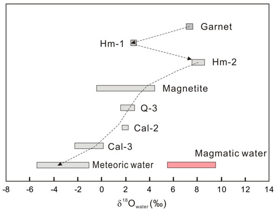 Compared with the fluids in equilibrium with garnet, the fluids in equilibrium with Hm-1 had isotopically lighter oxygen and plotted between the magmatic and meteoric water in Figure 4, indicating that the fluids were mixtures of magmatic and meteoric water. The δ18Owater values of the water in equilibrium with Hm-2 are in the range of 7.64‰–8.54‰, similar to those of magmatic fluids. Interestingly, compared to the Hm-1 data, the δ18Owater values of the water in equilibrium with Hm-2 are significantly increased (Figure 4). This feature suggests that a re-influx of magmatic water followed Hm-1 precipitation, or the fluids were in equilibrium with magmatic rocks before Hm-2 precipitation. The trend of decreasing δ18Owater values with time is clearly indicated by the calculated oxygen isotope compositions of fluids in equilibrium with Hm-2, magnetite, Q-2, Cal-2, and Cal-3 (Figure 4). This decreasing trend is paralleled by marked corresponding decreases in fluid salinity and temperature, as indicated by the fluid inclusion data [7], representing an initially magmatic origin progressively evolving by mixing with meteoric water.